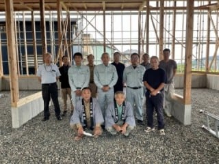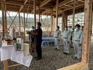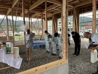 柱や梁など建物の基本構造が完成し、棟木を上げる際に行われる儀式で、建前や棟上げともいわれます。