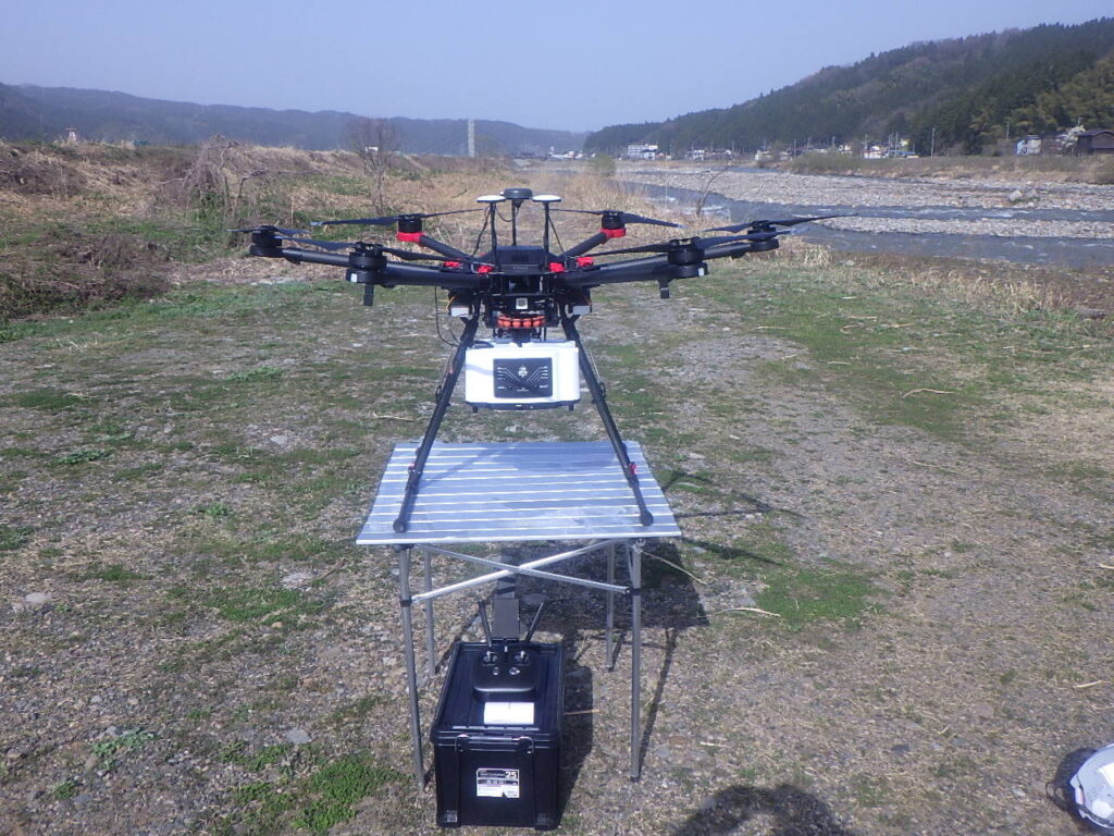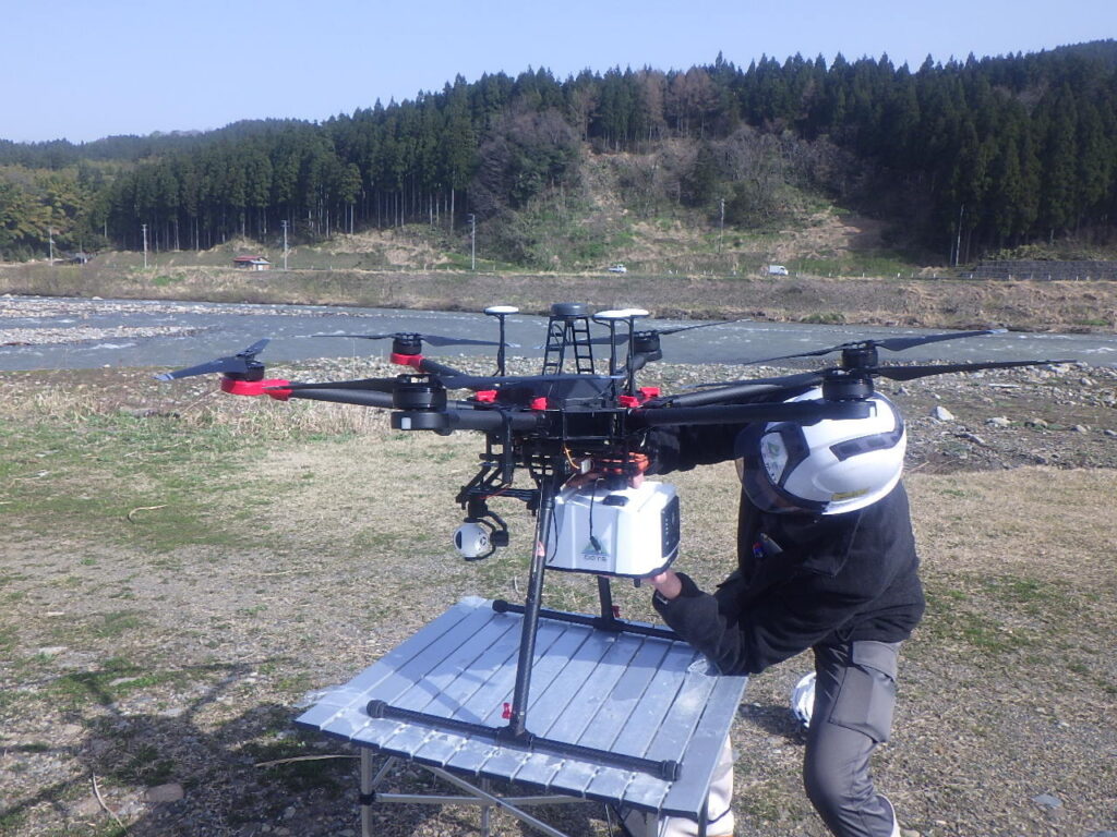ドローンのグリーンレーザー三次元点群測量を行いました。
