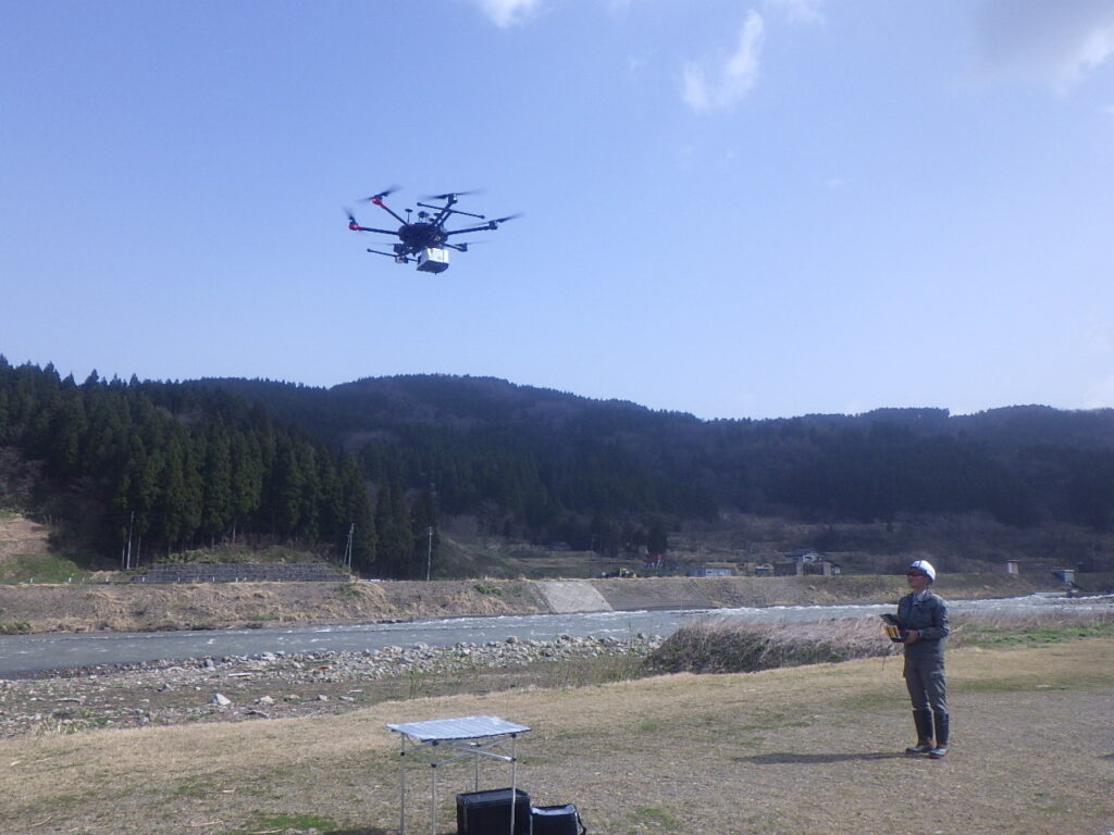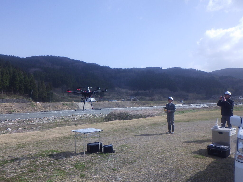 その間の堆積土量を把握するため、ドローンによる測量を行います。