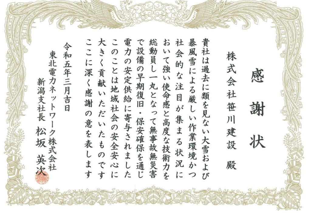 東北電力ネットワーク株式会社 様より『感謝状』を頂戴いたしました。