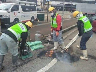 主に常温合材を使用して応急の路面復旧を行い、車両が通行出来るようになりました。