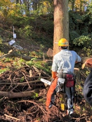 どのように伐採するのがベストか考えながら1本1本伐採する姿を見て、プロの技