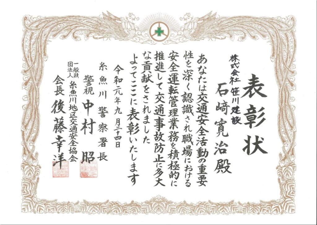 糸魚川地区交通安全協会さまより表彰をいただきました。