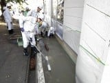 下の写真は、生コンで壁面が汚れないようにテープで養生しているところや