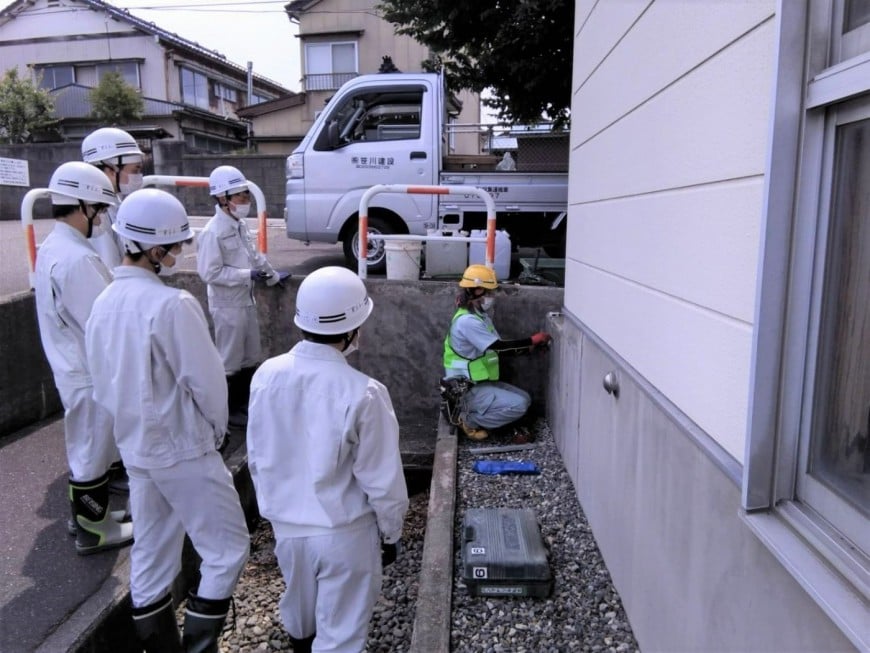 掲載写真は、機械のボルトを固定するための穴をあけたり、水の抜け道を作るためにコアを抜いたりしているところです。