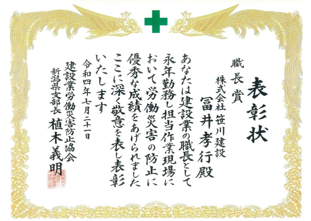 建設業の職長として、担当する作業現場において長年にわたり、労働災害の防止に努めたことを受けて、