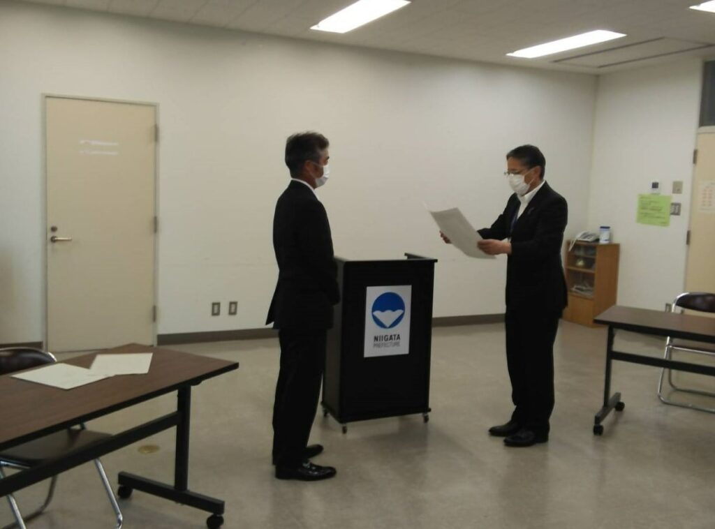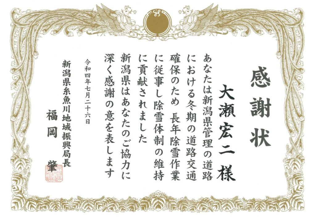 新潟県管理の道路における除雪作業に従事してきたことを受けて、