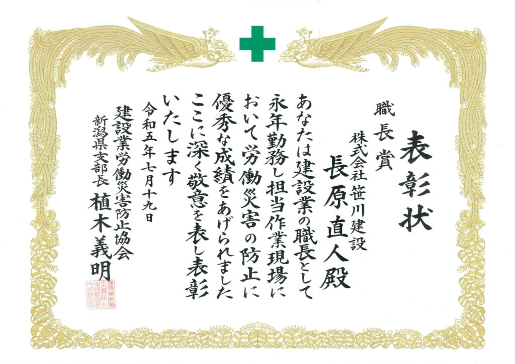建設業の職長として、担当する作業現場において長年にわたり、労働災害の防止に努めたことを受けて、