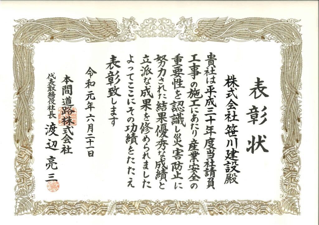 産業安全の重要性を認識し災害防止に努力したことが認められ表彰状をいただきました。